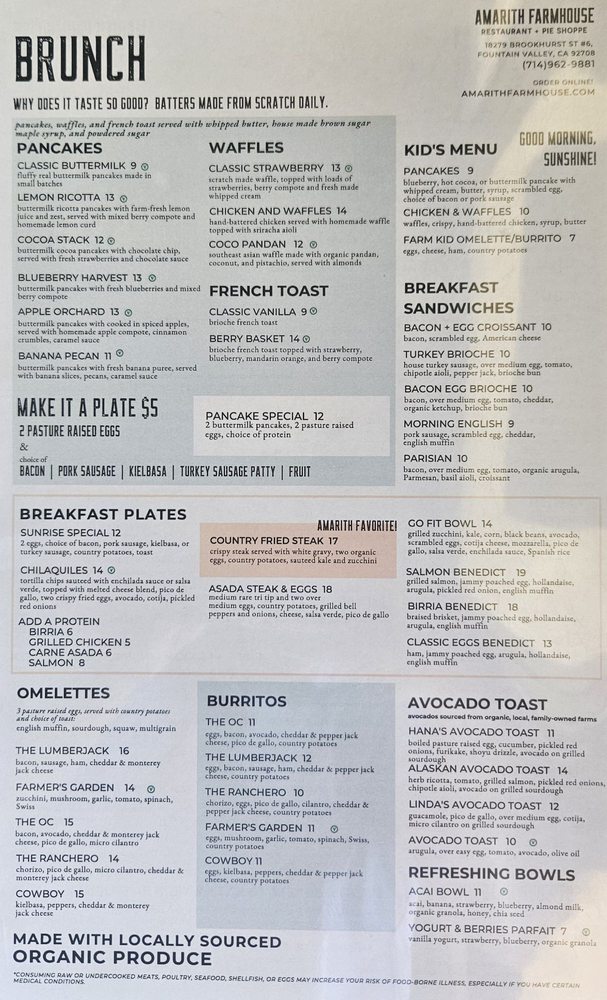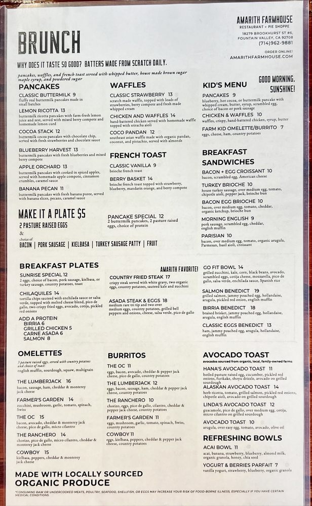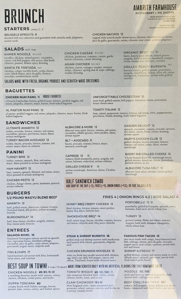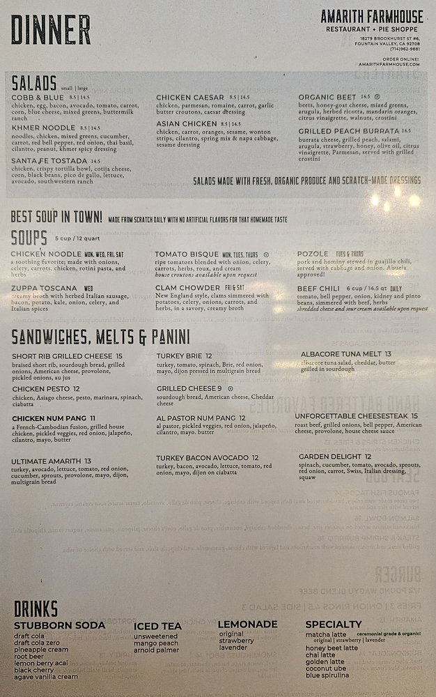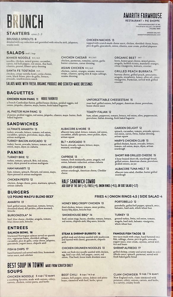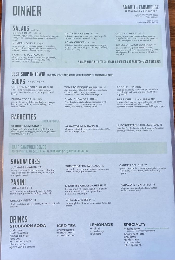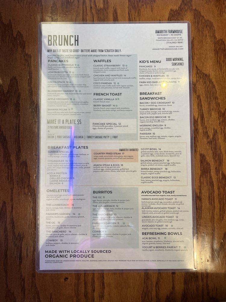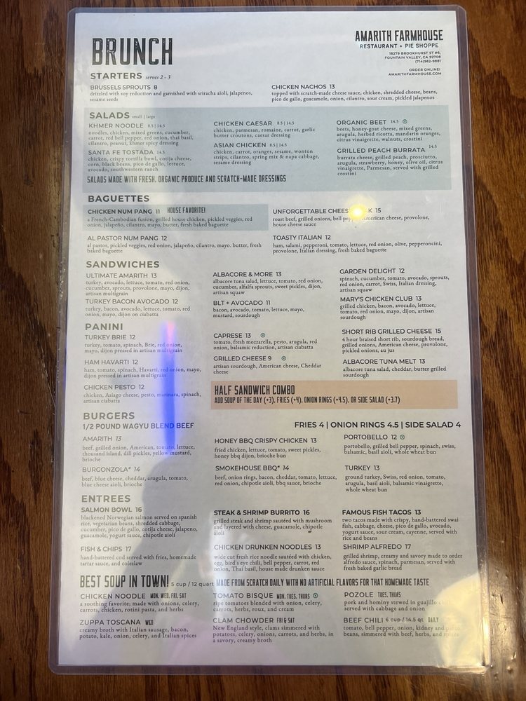 Discover the hidden gem of Amarith Farmhouse, a cozy restaurant in Fountain Valley, CA, offering a variety of menu options that cater to different dietary needs. From vegan and vegetarian dishes to hearty options like the OC breakfast burrito and salmon bowl, there's something for everyone. The charming farmhouse vibe adds to the dining experience, creating a warm and inviting atmosphere. While some customers praise the excellent food quality and friendly service, others mention slight delays in service. Overall, Amarith Farmhouse is a must-visit for those looking for a budget-friendly yet delicious meal with a side of hospitality. So, if you're in the area, stop by this quaint spot and enjoy a memorable dining experience.